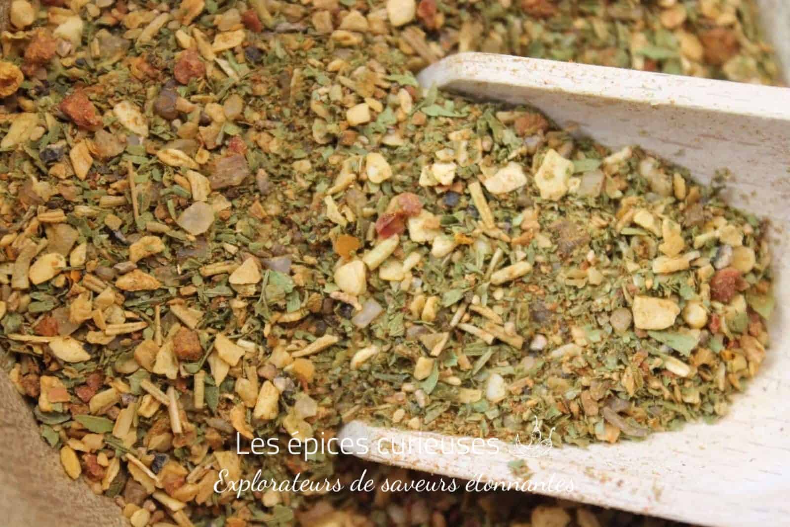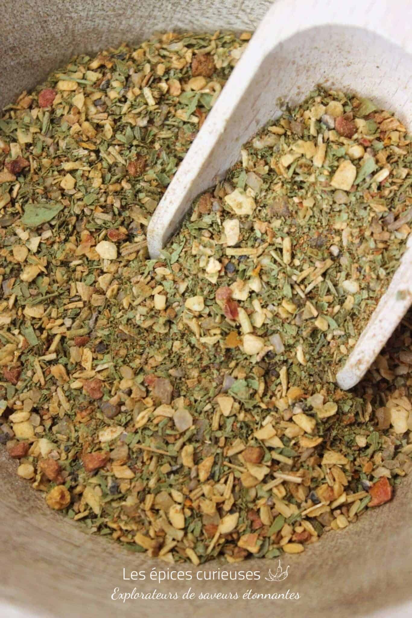 Composition : Sel fumé, oignon toasté*, tomates*, ail*, poivron*, poivre*, Persil*, ciboulette*, Livèche*, Romarin*, Marjolaine*, Noix de muscade*, Thym*.