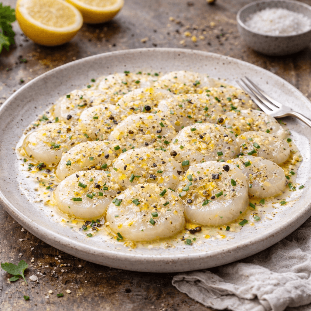 Découvrez notre carpaccio de Saint-Jacques ultra frais au Lemon Yuzu Pepper, une entrée élégante, légère et facile, idéale pour un repas raffiné.